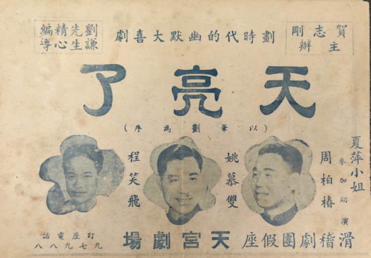 1949年7月,上海联合滑稽剧团排演的《天亮了》在天宫剧场上演,这是新中国成立之后上海编演的第一部滑稽戏,由姚慕双、周柏春、程笑飞、小刘春山、夏萍领衔主演。戏单上标注这是部“划时代的幽默大喜剧”,剧情表达了滑稽艺人欢庆解放的喜悦心情。据说,当时观众热情极其高涨,西藏路天宫剧场门口,票房铁门也被人群挤坏了。