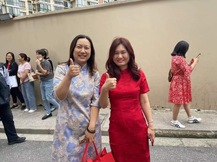 现场,很多妈妈特地穿了旗袍来送考。“希望紫气东来,孩子们旗开得胜,未来可期!”两位分别身穿紫色、红色旗袍的妈妈现场为孩子们打气。