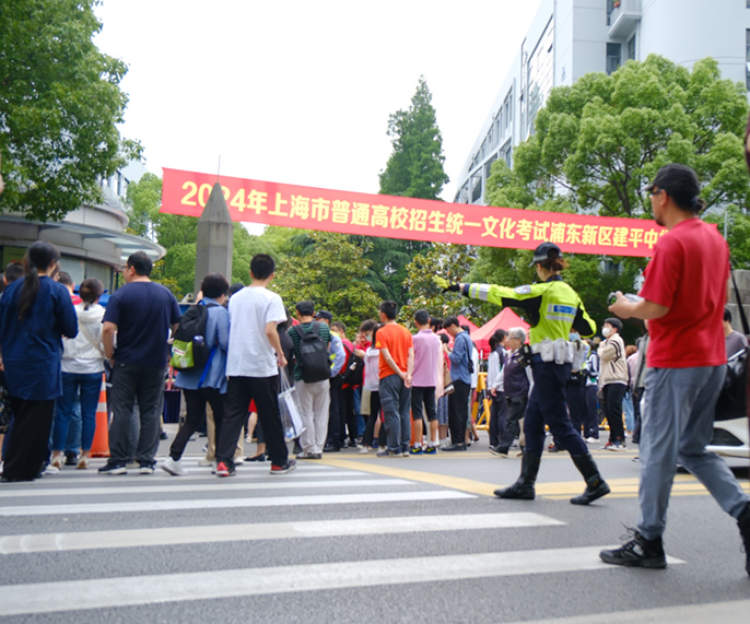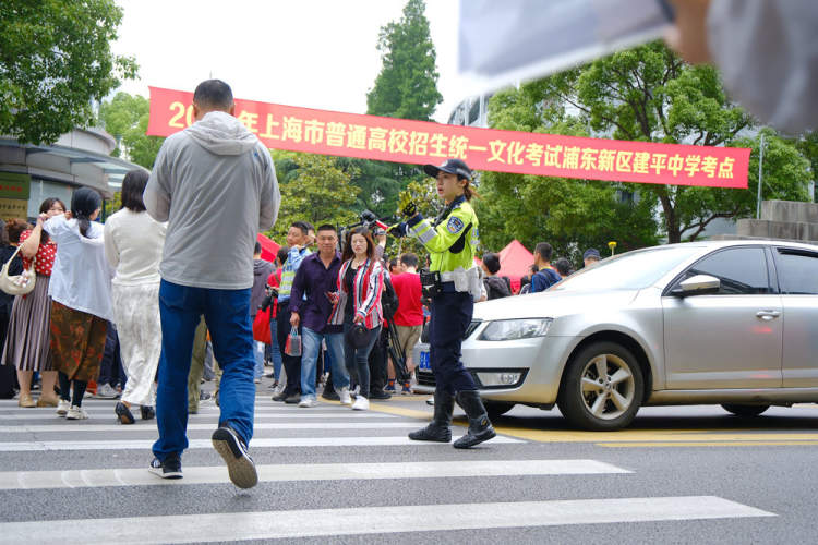 在上海市建平中学校门口,交警支队一大队东方明珠女警中队的女警们按照“一点一方案”,在考点周边路口设置了禁止鸣笛等标识牌,为考生营造“安静环境”,并在考点周边道路上通过人工指挥,分流疏导送考车辆,保障校门口畅通有序。每当有学生与送考人员需要过街时,女警都会示意车辆优先礼让。在女警指挥下,到达学校附近的送考车辆即停即走,保障了考点门口秩序井然。与此同时,,东方明珠女警中队的女警还提前联系了周边商场停车场,为送考车辆停车提供方便,让考生们安心赴考,让家长舒心送考。