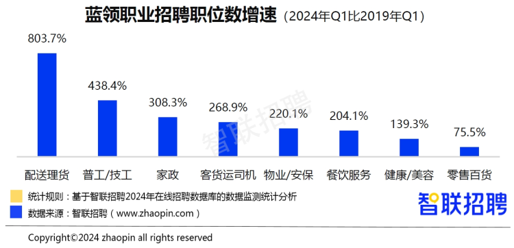近日,智联招聘发布《2024蓝领人才发展报告》,其中值得重点关注的是蓝领招聘职位数逐季波动上升,今年一季度已经达到了2019年同期的3.79倍;电商快速发展驱使蓝领人才需求显著增加,较5年前上涨了8倍;同时随着蓝领行业整体的薪资及待遇提升,25岁以下投递人数5年前增长165%……