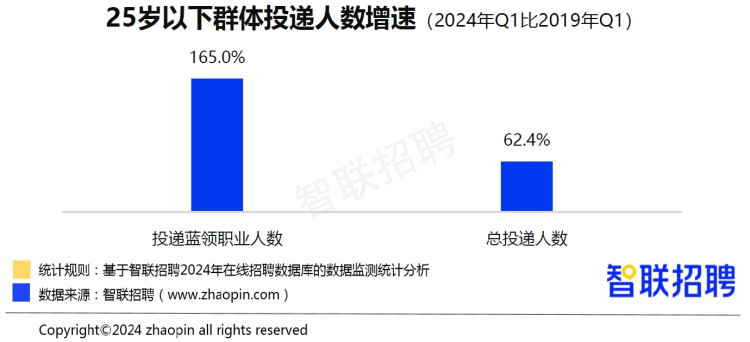 随着蓝领职业的薪资待遇及工作环境逐年提升,也吸引了更多年轻人投递。今年一季度,25岁以下群体投递蓝领职业的人数比2019年同期增长了165%,增速高于全平台25岁以下群体投递人数增速的62.4%。