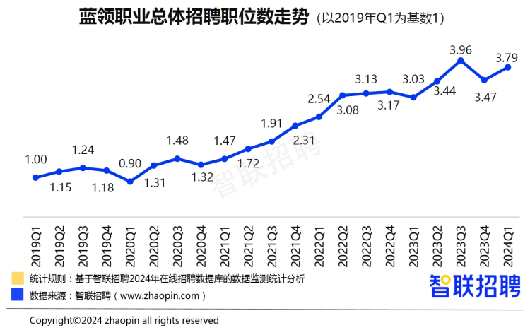 随着经济高质量发展稳步推进,制造业转型升级,服务型消费需求增长,带动蓝领人才招聘需求增加。智联招聘数据显示,2019年以来,蓝领岗位招聘需求持续上升。以2019年一季度为基数1,蓝领招聘职位数逐季波动上升,至今年一季度达到3.79,是2019年一季度的3.79倍。