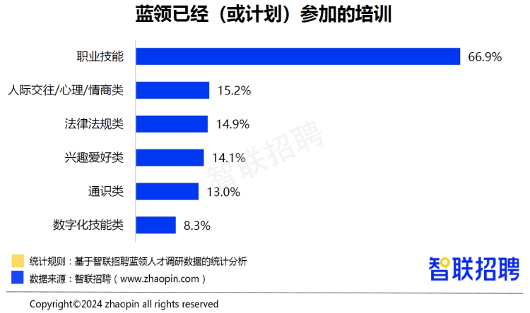 职业技能培训方面,共有68.7%的受访蓝领接受过学习培训。其中,84.8%表示主要培训渠道是公司组织的员工培训。从蓝领已经或计划参加的培训内容看,职业技能类占比66.9%,排名第一;职业技能与蓝领的工作内容密切相关,因而在培训中具有比较高的重要性;其次是人际交往、法律法规、兴趣爱好类。