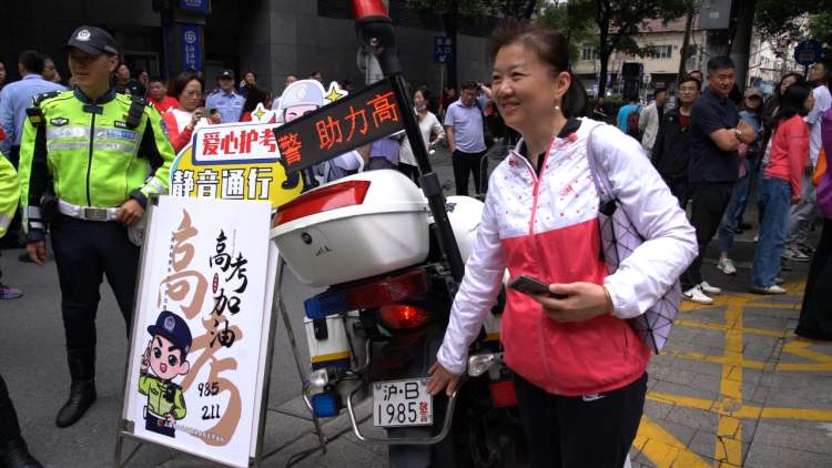 而在黄浦区格致中学门口,一辆“沪B1985警”的警用摩托车同样吸引了不少考生的关注,在等待考生进入考场前夕,有的家长还专门让孩子和车牌合影,寓意“要进985”,希望能够考取心仪的学校。