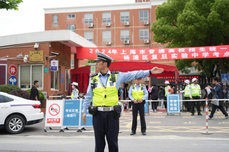 在复旦实验中学考场门口,属地杨浦交警支队三大队在高考前一日,对考场周边道路进行交通安全隐患排查,并摆放反光锥桶设置安全通行区域。高考期间,交警将在考场相邻路口布置固守警力,严禁大型货运车辆途径考场、严格管控车辆鸣号,考生进校和离校时强化路口管控,构建进出校“绿色通道”,确保车流和人流快速安全通过,道路交通秩序井然,考生安全有序入场。