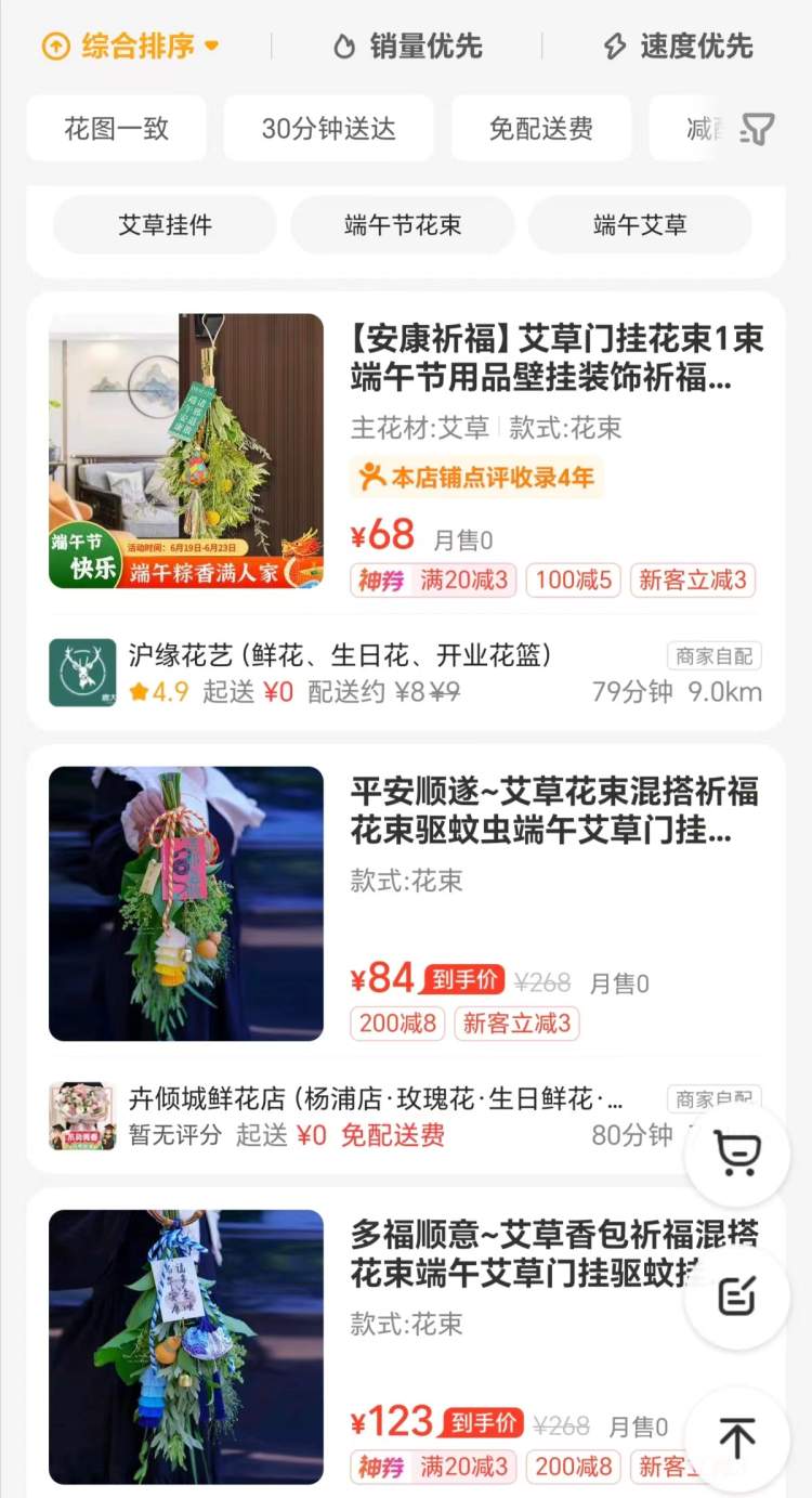 电商平台上,销售艾草花束DIY材料包的店铺不少,销量也都不错。甚至买菜平台上,也有艾草DIY材料包销售,还出现了断货的情况。