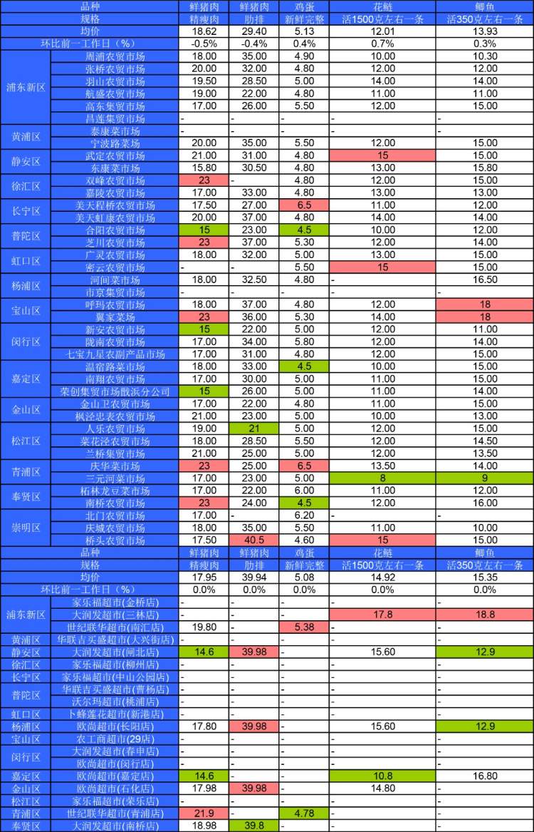 ■粉底标注代表该肉蛋鱼品种在上述农贸市场或超市的最高价;绿底标注代表该肉蛋鱼品种在上述农贸市场或超市的最低价。