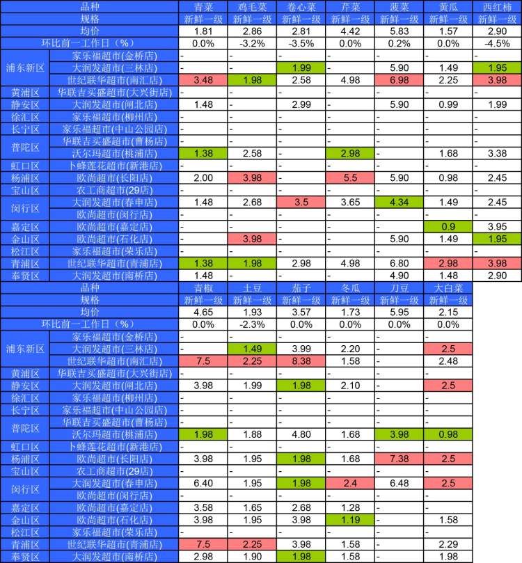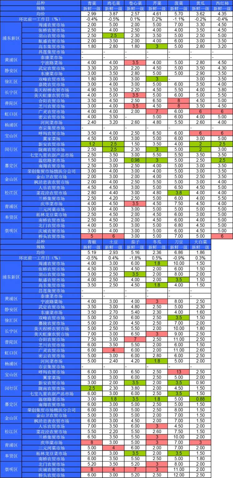 ■粉底标注代表该蔬菜品种在上述农贸市场或超市的最高价;绿底标注代表该蔬菜品种在上述农贸市场或超市的最低价。