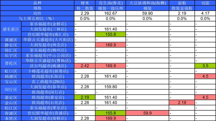 ■粉底标注代表该粮油品种在上述超市的最高价;绿底标注代表该粮油品种在上述超市的最低价。