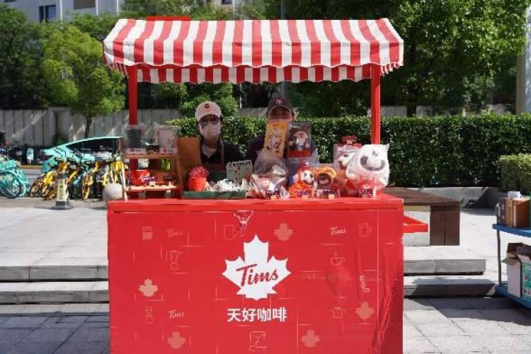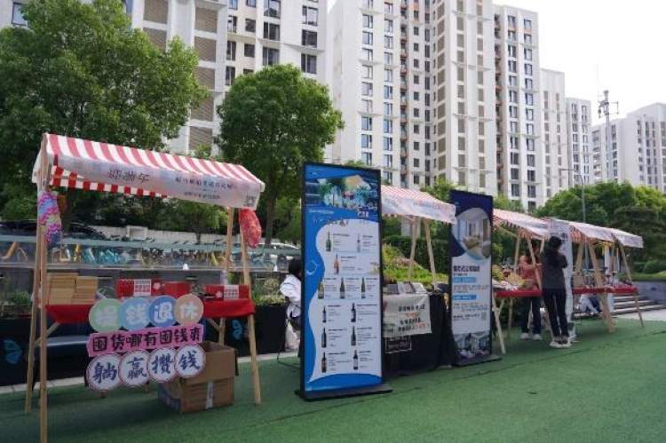 现场摊位展示。有来自原竹琥珀的+-颂钵音疗冥想中心、PIZZICATO(音乐辅导)、维泽·自如寓、TIMS咖啡,也有来自古北园区的旺旺、乐扣乐扣以及进口品等。