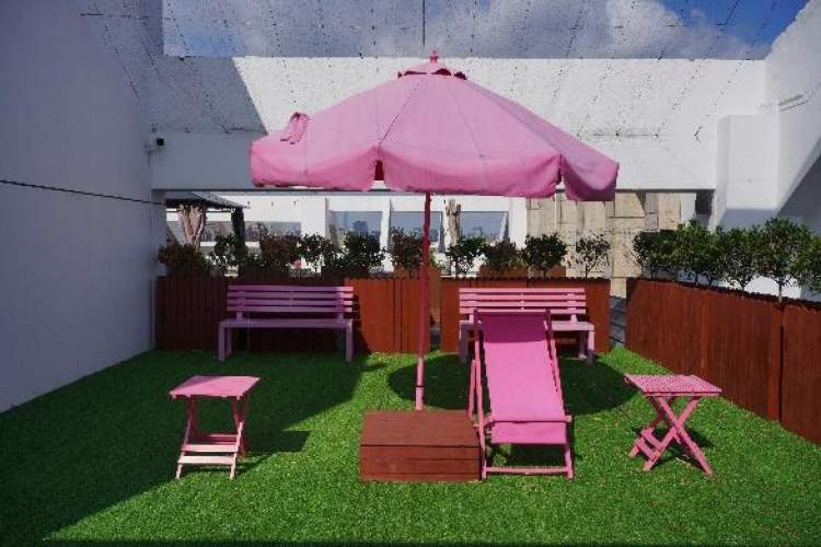 原竹琥珀18楼潮流天台全景图。天台布置时尚,色彩斑斓,各类植物和装饰品点缀其间,营造出轻松愉悦的氛围。