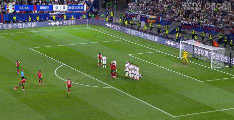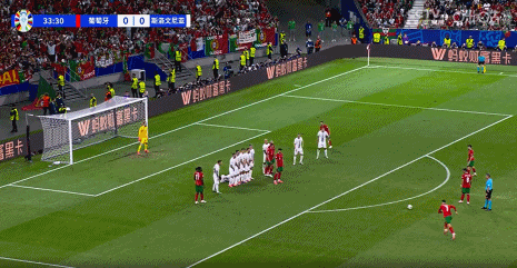 第35分钟,C罗前场任意球直接攻门,皮球擦着横梁飞出底线。