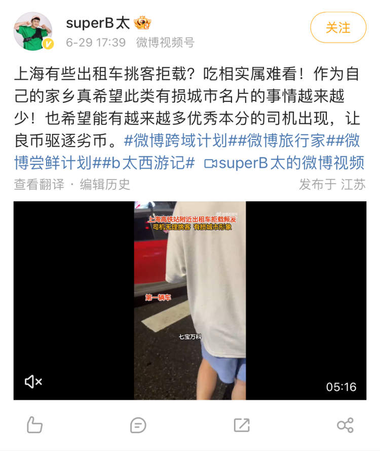 “上海有些出租车挑客拒载?吃相实属难看!”6月29日,知名打架博主B太发博文称,因其目的地距离过近,在上海打车时惨遭司机接二连三地拒载。