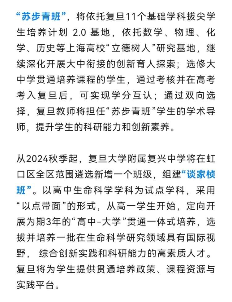 面向数学科学和生命科学两大学科研究领域具有突出发展潜质的附属复兴中学学生,双方将深化建设“苏步青班”,并新建“谈家桢班”,探索拔尖创新人才的“早发现早培养”和超前发展。