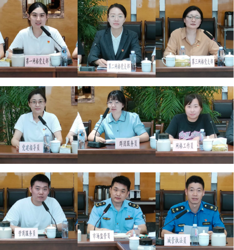 镇党委书记王春明,镇党委副书记黄诚,镇党委委员、组织委员宋旸以及镇职能科室、三大网格党支部书记、网格长及全体“六员”(党建指导员、群团服务员、网格工作员、营商服务员、市场监管员、城管执法员)参会。