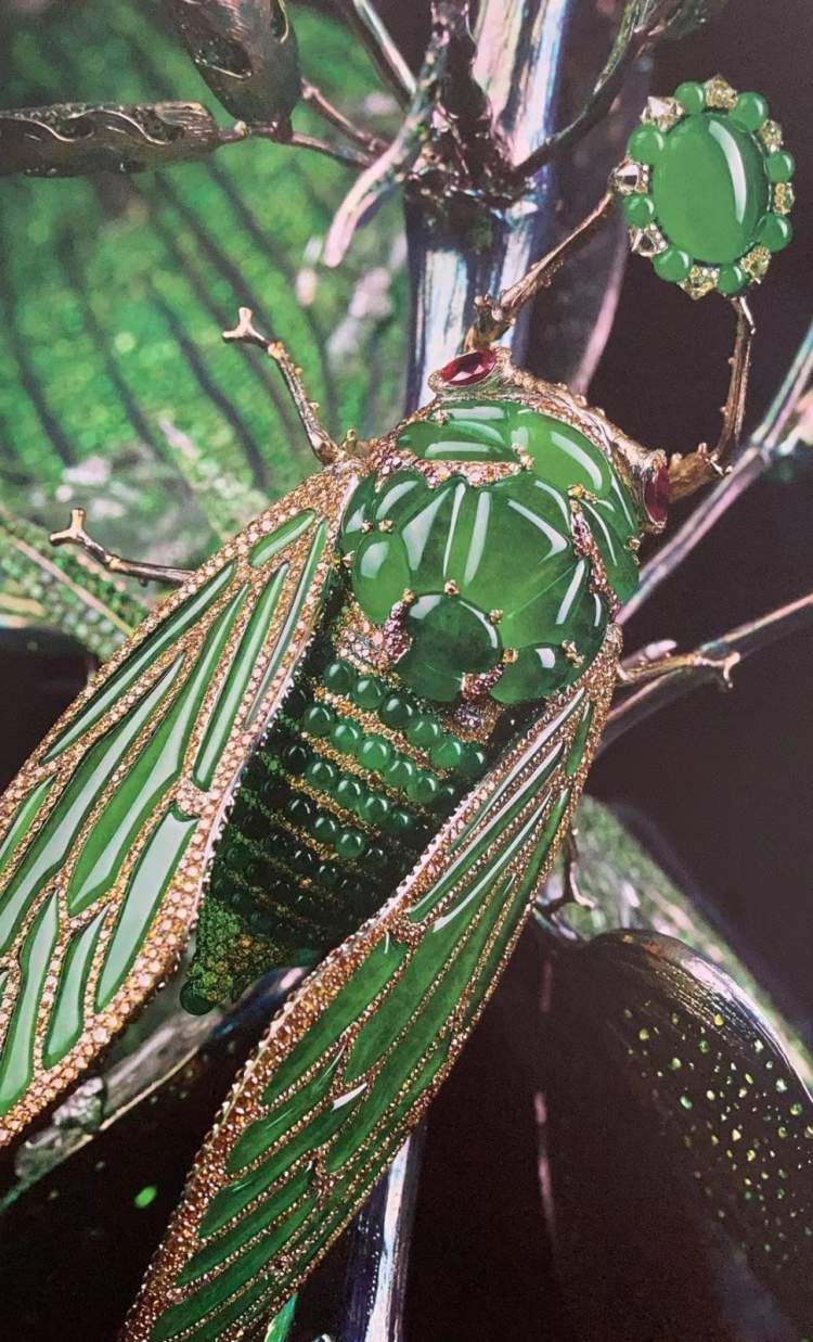 名作《悟禅知翠》描绘了蝉的启悟。16岁时,陈世英学徒生涯中遇到的第一个难题便是玉蝉。经过40年的历练,他终于在2012年完成了这件作品。作品中的蝉抱着一颗帝王翡翠,背面镶嵌温润的紫罗兰翠玉,展现了陈世英的翡翠切割润光专利技术。