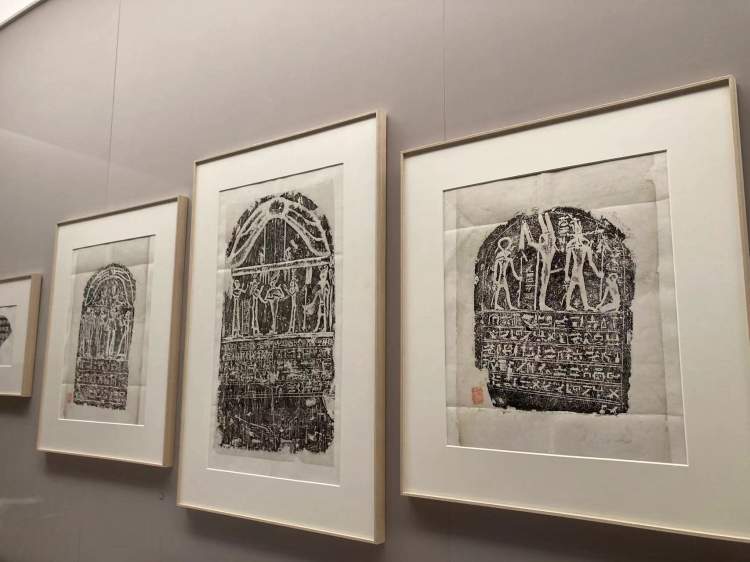 在展示古埃及彩绘石碑时,对面展出了上博所藏清末金石学家端方所拓印的埃及石碑拓片。这些拓片这是端方从自己1905年出访埃及时所购石碑上所拓印的。中国官员初次见到古埃及石碑,运用金石学方法进行研究,并用金石学手段制作了复制品、拓片,还模仿古埃及石碑的图案和铭文进行再创作,等于是百年前两大文明古国之间的一次交流对话。