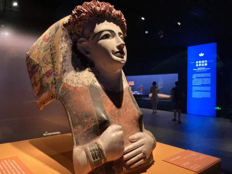 文明对话,始终贯穿着“法老的国度”板块。展厅门口,赫然布置着古代中国和古代埃及历史年表的对照,从约公元前8800年至前4700年的萨哈拉新时期时期&距今约8000年至7000年的斐李岗文化、跨湖桥文化,一直对比到公元前30年至公元395年的罗马埃及时期&公元25年的汉光武帝刘秀定都洛阳。