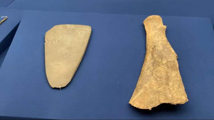 对照展出的古埃及调色板(左)和中国商代寄祷刻辞卜骨