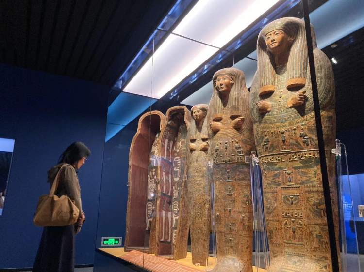 展厅内,巨大的彩绘木乃伊棺木,无论是竖立陈列,还是躺平陈列,都给人巨大的视觉冲击力。
