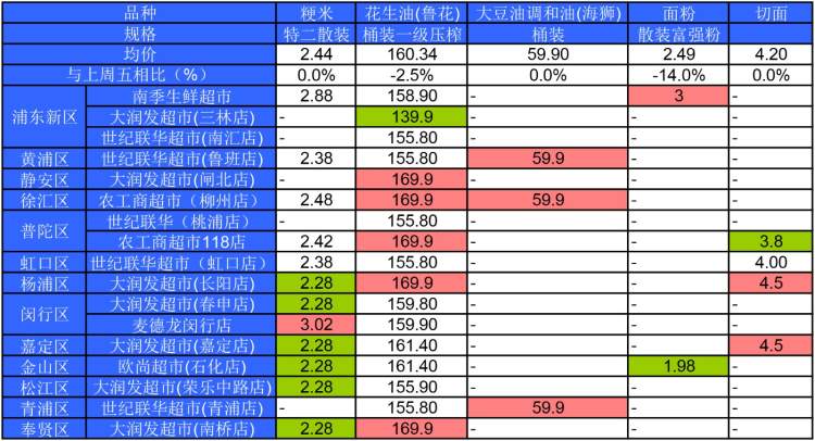 ■粉底标注代表该粮油品种在上述超市的最高价;绿底标注代表该粮油品种在上述超市的最低价。