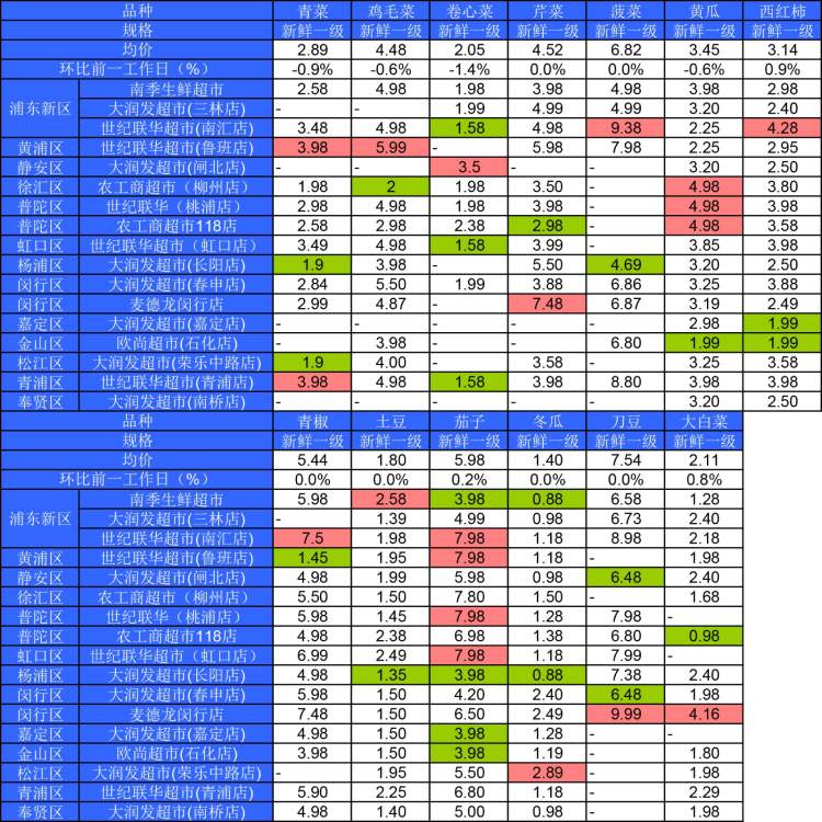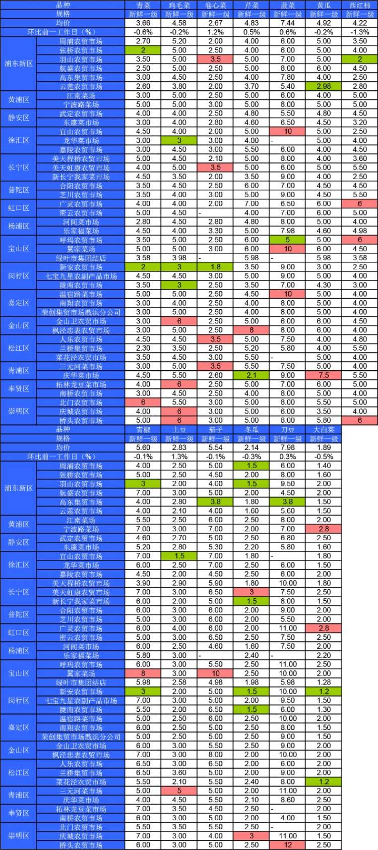 ■粉底标注代表该蔬菜品种在上述农贸市场或超市的最高价;绿底标注代表该蔬菜品种在上述农贸市场或超市的最低价。