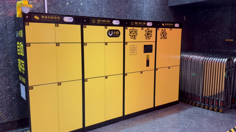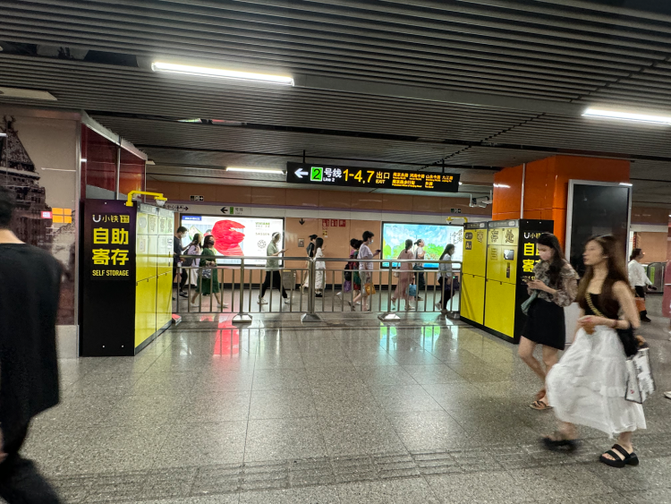 人民广场地铁站共有1号线、2号线、8号线三条线路,每条线路的扶梯附近各放置了一组寄存柜。