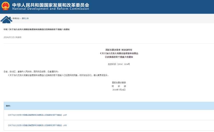 7月25日,“国家发展改革委”微信公众号发布“国家发展改革委 财政部印发《关于加力支持大规模设备更新和消费品以旧换新的若干措施》的通知”一文。