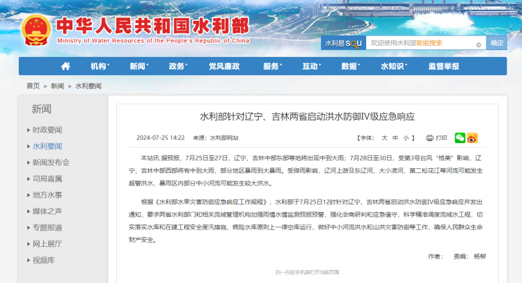 根据《水利部水旱灾害防御应急响应工作规程》,水利部于7月25日12时针对辽宁、吉林两省启动洪水防御Ⅳ级应急响应并发出通知,要求两省水利部门和相关流域管理机构加强雨情水情监测预报预警,强化会商研判和应急值守,科学精准调度流域水工程,切实落实水库和在建工程安全度汛措施,病险水库原则上一律空库运行,做好中小河流洪水和山洪灾害防御等工作,确保人民群众生命财产安全。