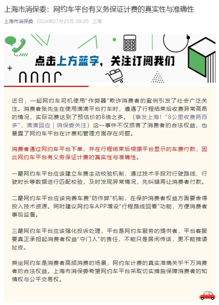 7月25日,“上海市消保委”微信公众号针对此事发表文章,建议平台完善防作弊机制。文章中,上海市消保委表示,消费者通过网约车平台下单,并在行程结束后根据平台显示的车费付款,因此网约车平台有义务保证计费的真实性与准确性。