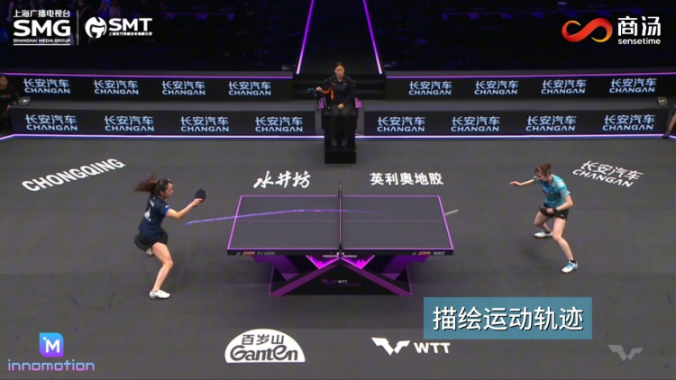 通过AI智慧赛事转播,可实现旋转速度、方向可视化,运动轨迹描述,击球落点显示等