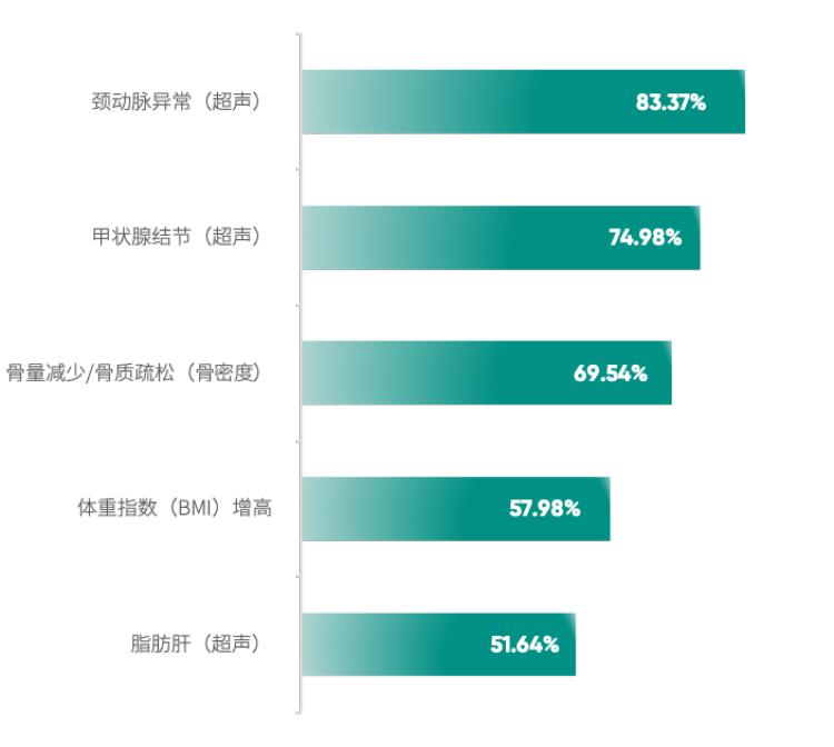 整体结果显示,排除与性别相关的前列腺异常、乳腺结节等体检异常结果,颈动脉异常(超声)在60岁及以上体检人群中的检出率最高,每5人中超过3人受骨量异常问题困扰,往下依次为甲状腺结节(超声)、骨量减少/骨质疏松(骨密度)、体重指数(BMI)增高和脂肪肝(超声),检出率均超过5成。