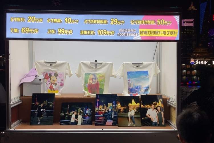 另一些“亭子”则还提供热转印的制品服务,标价显示,8寸热转印板画39元/个,12寸热转印板画50元/个,T恤69元/件,卫衣99元/件,连帽卫衣109元/件。“亭子”上的“外滩摄影”相关宣传显示,“外滩摄影”的经营公司为上海乐程环景影像服务有限公司。