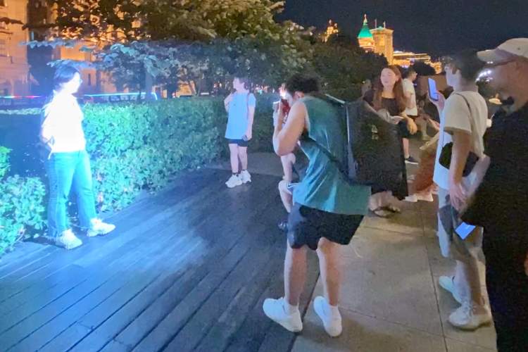 众所周知,外置闪光灯和柔光箱的使用会大大提高夜间人像拍摄的质量,由于外滩平台晚上人山人海,外置灯光的使用势必会影响游客通行,容易绊倒砸到游客,也会形成人员聚集,造成安全隐患,因此不具备使用外置灯光的条件,不得已使用机头闪光灯,这也是遗憾吧。”
