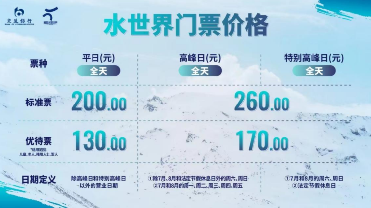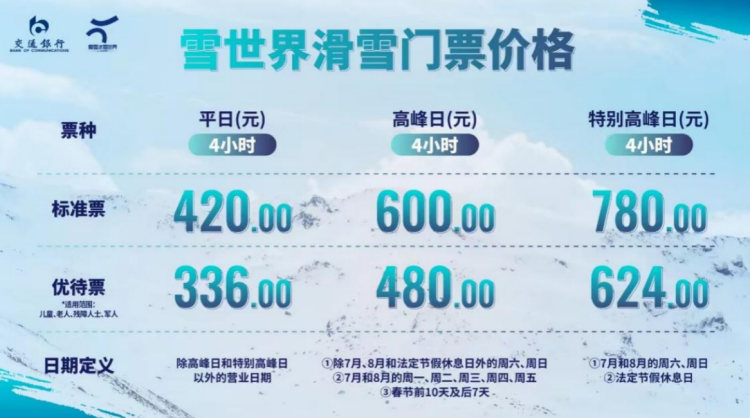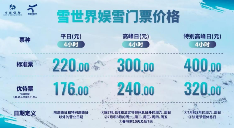 7月26日,交通银行耀雪冰雪世界首次公布部分官方门票价格。根据旅游淡旺季,票种被分为平日票、高峰日票和特别高峰日票。雪世界滑雪门票420元/4小时起,娱雪门票220元/4小时起,水世界200元/4小时起。
