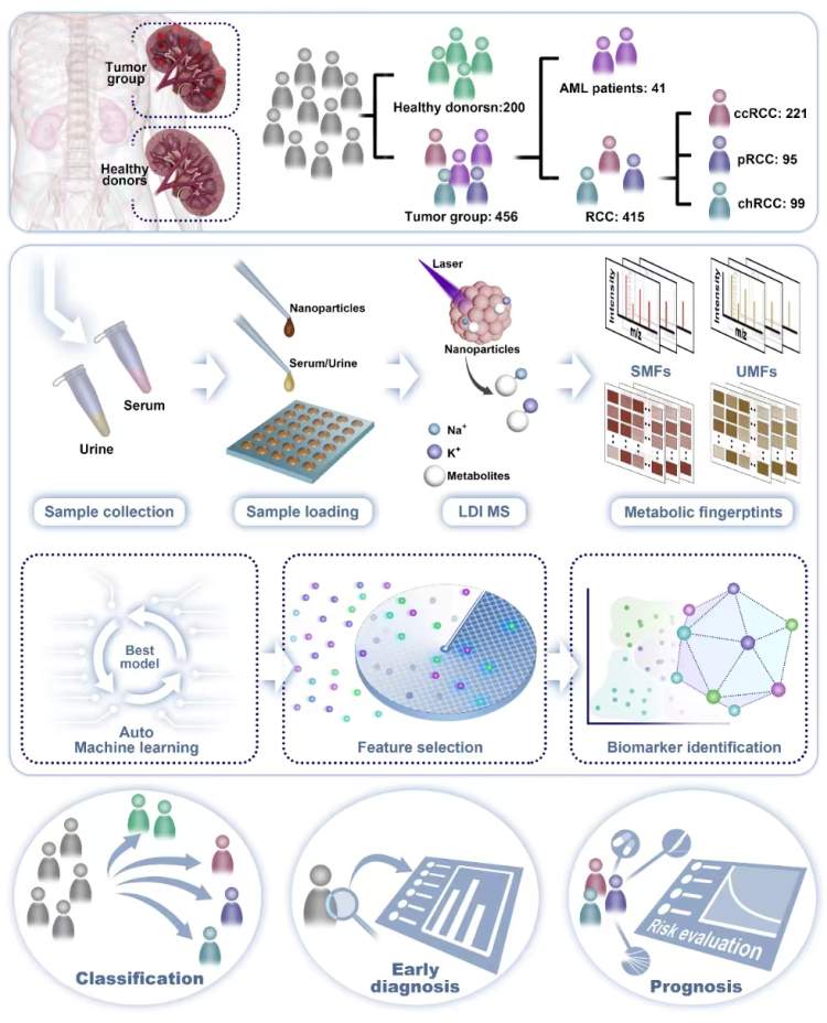 在此研究中,作者首先构建来自仁济医院的SUPER肾肿瘤研究队列,进一步开发一种高效的血清和尿液代谢指纹分析方法,并利用机器学习成功对肾肿瘤进行亚型分类、早期诊断和预后。