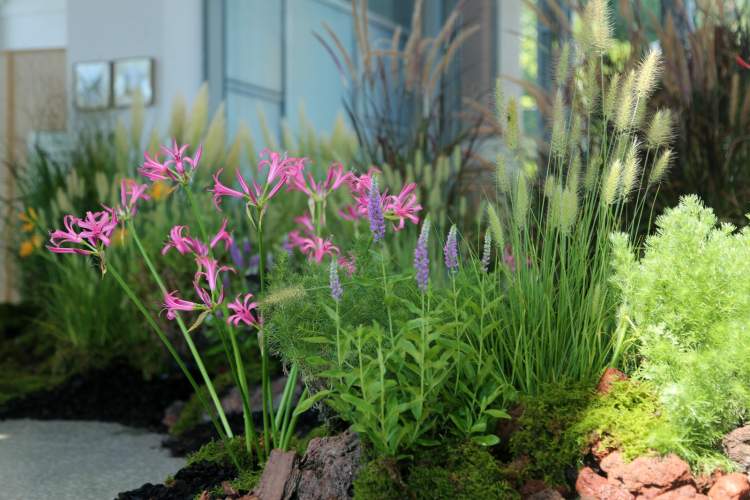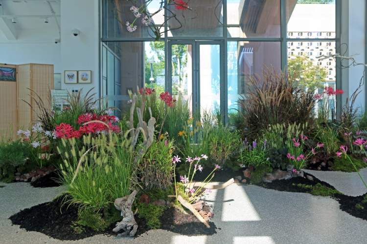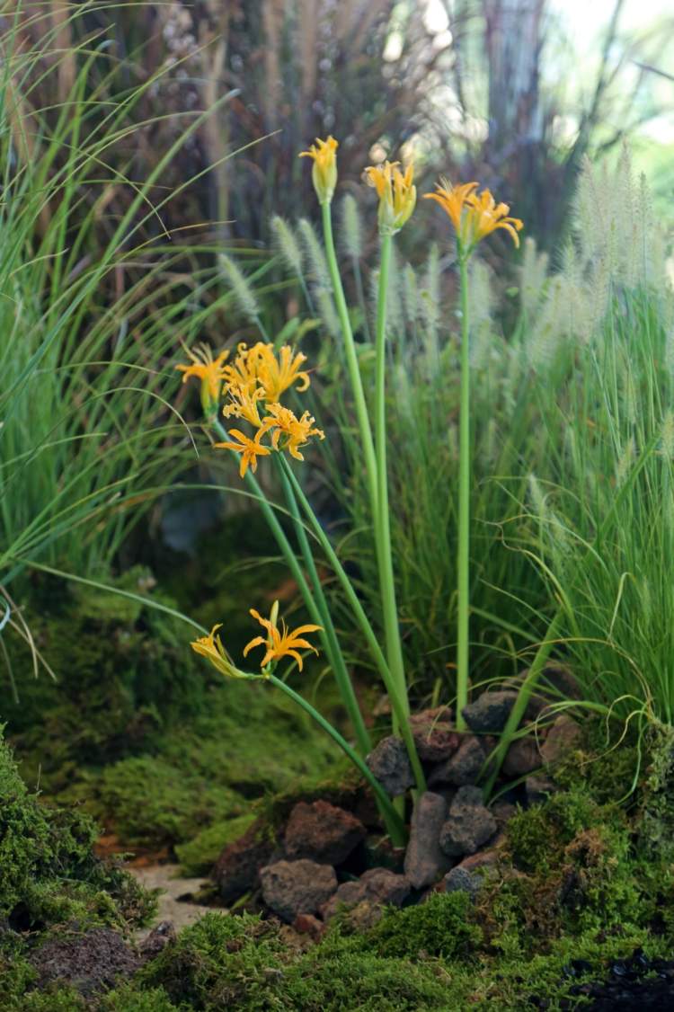 走进花艺展示区,可以看到枯木、藤条等材料制作的悬垂而下的花艺景观,地面上,起伏的地形和紫叶狼尾草、火焰柳枝稷、小兔子狼尾草等观赏草结合,石蒜错落有致分布其中,让人感受到石蒜的靓丽与自然之美。