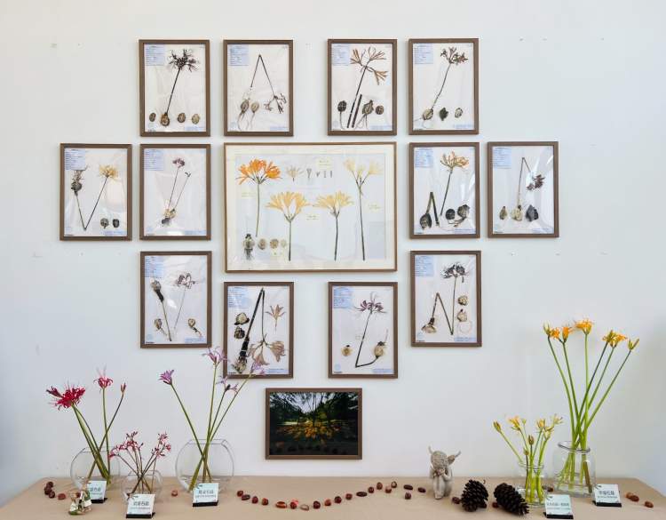 在手工展示区,可以看到上海植物园志愿者们制作的石蒜扭扭棒、石蒜衍纸画、石蒜折纸等多组作品,也有多幅水彩、彩铅等石蒜绘画作品,都惟妙惟肖。为了更好地科普不同种石蒜之间的形态区别,此区域还展示了13组石蒜标本,以及趣味石蒜中药拼贴画。