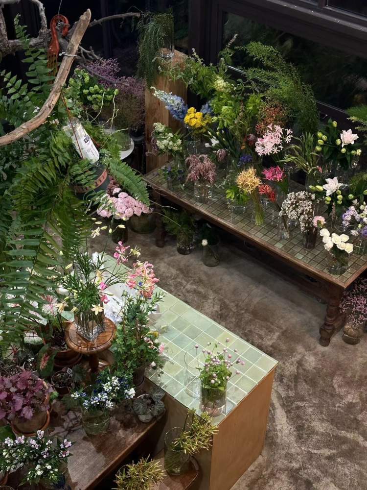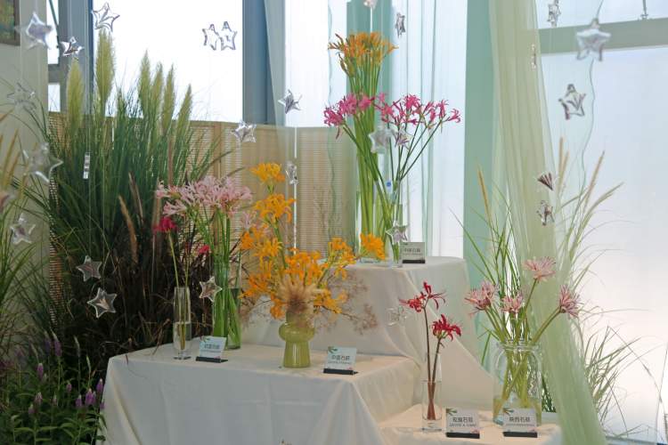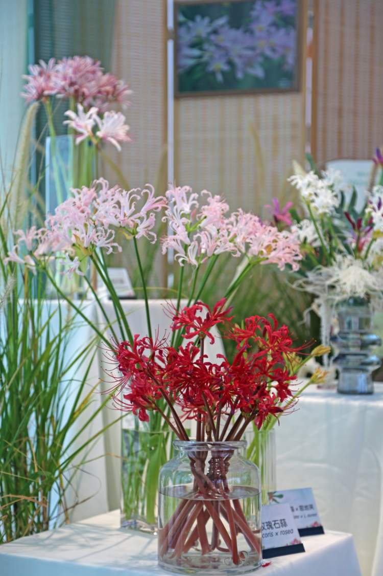 在品种展示区,可以看到诸多石蒜品种的瓶插展示和花艺作品。在武陵石蒜制成的滴胶垂帘和纱幔的映衬下,石蒜与各类观赏草的组合显得更加缥缈仙逸、别具一格。