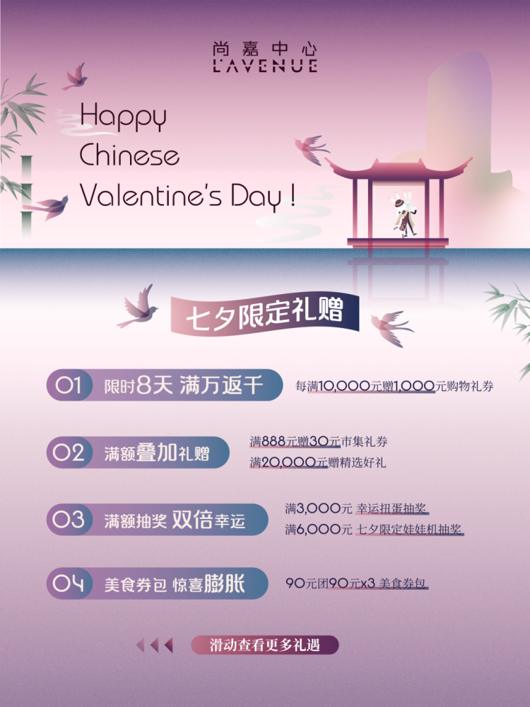 七夕佳节,长宁不少商场推出特别礼赠活动。尚嘉中心限定满额返券,买的多返的多。同时还联动商场多家餐饮发出美食券包,遇·虹桥淮扬菜、IL GIARDINO意大利餐厅、gaga西餐等均可使用。
