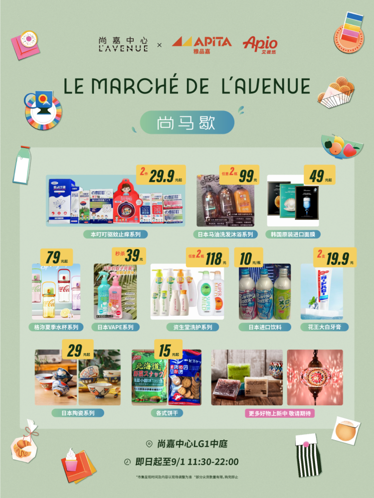 除此之外,逛市集也可以很浪漫!尚嘉中心联合APITA雅品嘉带来日式进口商品、夏日纳凉新品等特价好物,品类多达上百种。