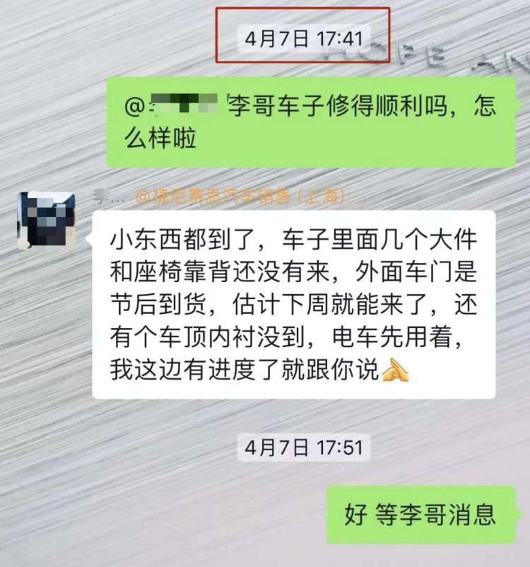 除了维修周期长,对于4S店的服务态度,也让陈先生感到体验不佳,即便售后人员表示有了新的进展会来告诉他,但他也没等来一次“主动告知”。