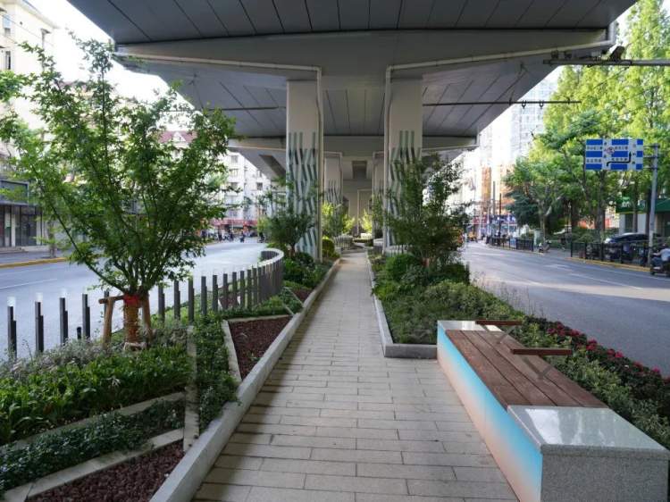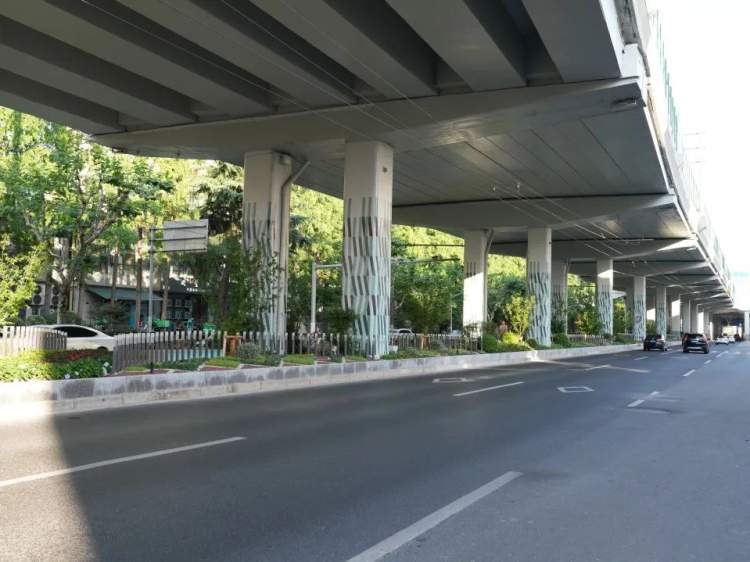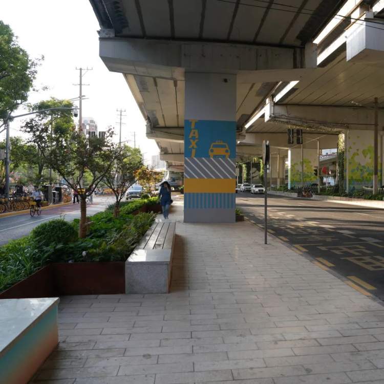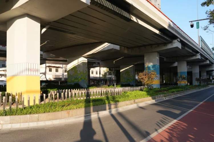 梳理原本单调的桥下隔离绿带,结合图案化和多层次组团种植,丰富视觉效果。色彩鲜明的桥柱几何图案涂刷,提升人们在桥下空间的休闲体验。步道沿线嵌入三处座椅休憩空间,也为过往行人提供停留和休息的场所。