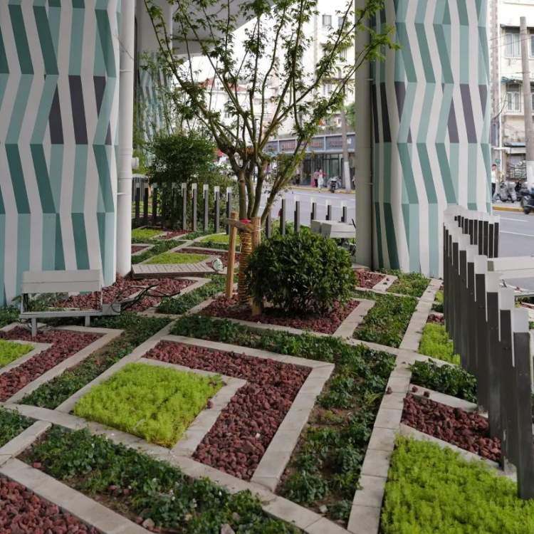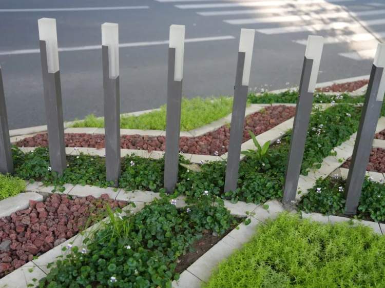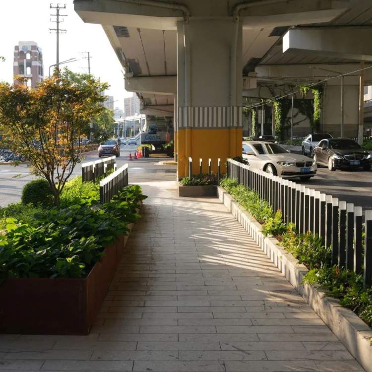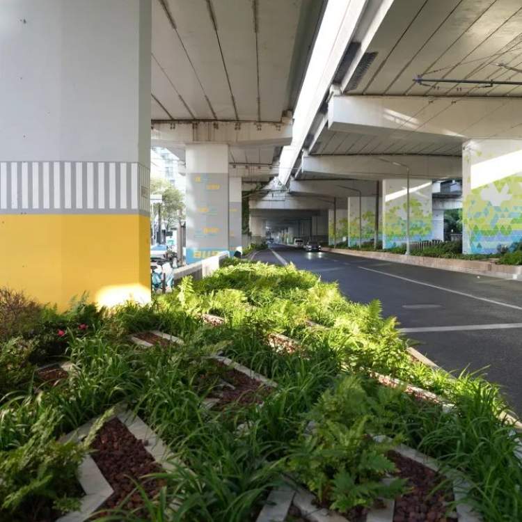 适应桥下空间光照条件,打造特色阴生种植园。通过地被层、修剪球类和小灌木三层种植结构,增加空间的层次感。并挑选适合低光照条件的植物,如佛甲草、麦冬、蕨类、矾根、玉簪、葱兰、亮晶女贞球、水果兰球、杜鹃球、茶梅、南天竹等,增加植物的多样性,形成小型生态系统。两侧的LED灯隔离栏,可为阴生植物提供必要的补光,成为一处阴生植物的科普点。