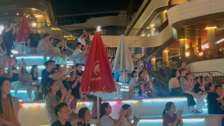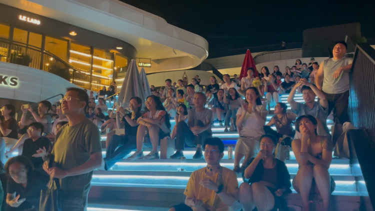 在现场,市民李先生和他的朋友特意选择来这里感受奥运氛围,并为此提前预约了大屏幕前的沙发座抢占C位。“之前有个朋友提议来看露天比赛,我当时正好在附近吃饭,觉得这里的环境很好,所以就决定体验一下。今天再来看,氛围比那时候更加火热了,比赛没开始的时候,全场观众就开始兴奋了。”