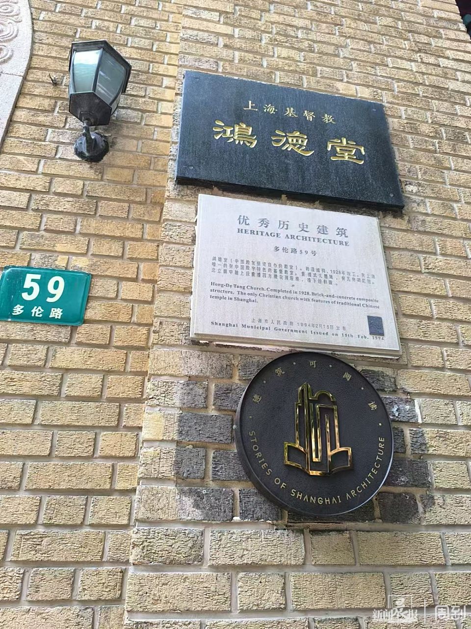 我们的Citywalk从多伦路文化名人街的牌坊下开始。经过多伦现代美术馆,向着这条L型街的西面和北面走,唐吉慧的目光首先被中式古典建筑风格的鸿德堂吸引。“多伦路”59号门牌旁,有一块优秀历史建筑的名牌,下面还有“建筑可阅读”的标识。