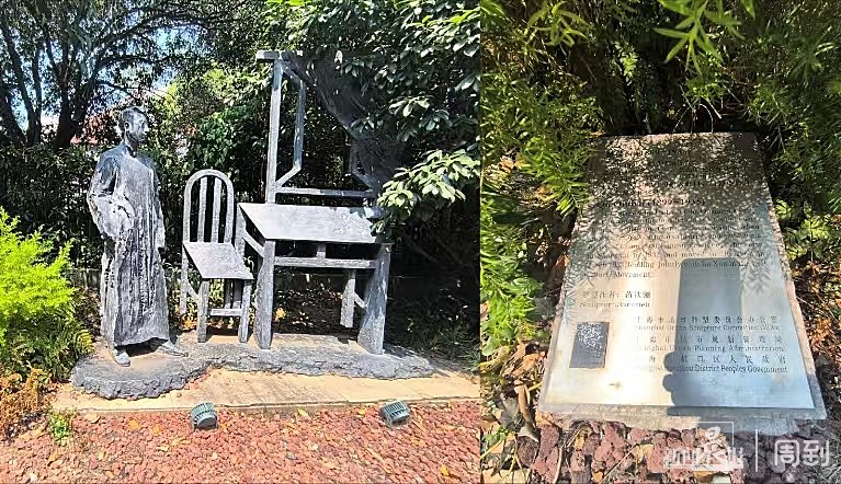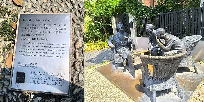 街对面的花园式老建筑前,有一组三人座谈的雕像。名人雕像沿街分布,也是多伦路文化名人街的特点。通过雕像中年长者的面容、姿态,我们判断出他是鲁迅先生。另外两个人是谁?在雕像脚边,我们找到了一块金属标牌,上面用简短的中英双语介绍了鲁迅的生平,但没有介绍雕像主题。雕塑作者的名字下有一块二维码,但已锈蚀,更无法扫出。记者蹲下来努力看,只能依稀辨出二维码下还有“扫码……的导览”字样。