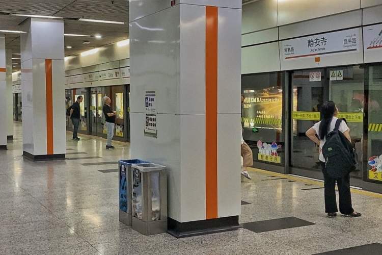在2号线、14号线静安寺站站台,均设有两组垃圾桶。2号线静安寺站台的垃圾桶分别位于徐泾东方向12、35号屏蔽门附近,垃圾桶侧放于柱子旁边,两个方向上下车的乘客基本都能看到。