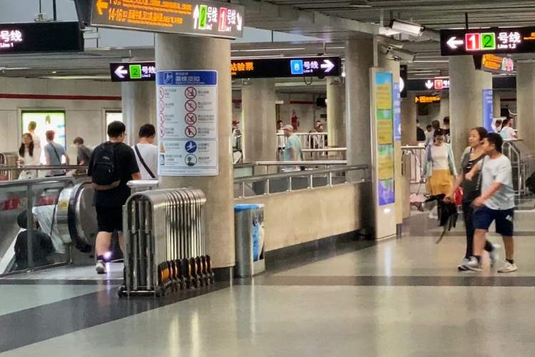 人民广场站作为3站换乘、人流密集的大站,本以为三角换乘大厅的垃圾桶位置很显眼。但,在1、8号线换乘区域,记者转了好几分钟,才在一个1号线进站扶梯侧面柱子的旁边,找到1组紧贴扶手栏杆的垃圾桶。