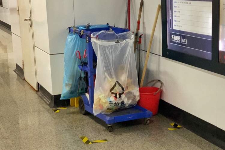 还有一些站台,保洁员使用的垃圾推车停放在较为显眼的工具摆放区,起到了“辅助垃圾桶”的作用。